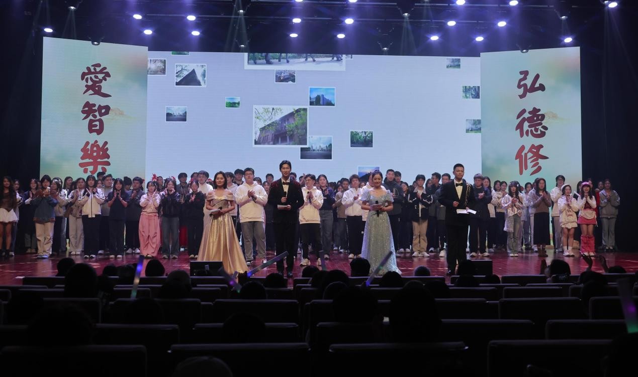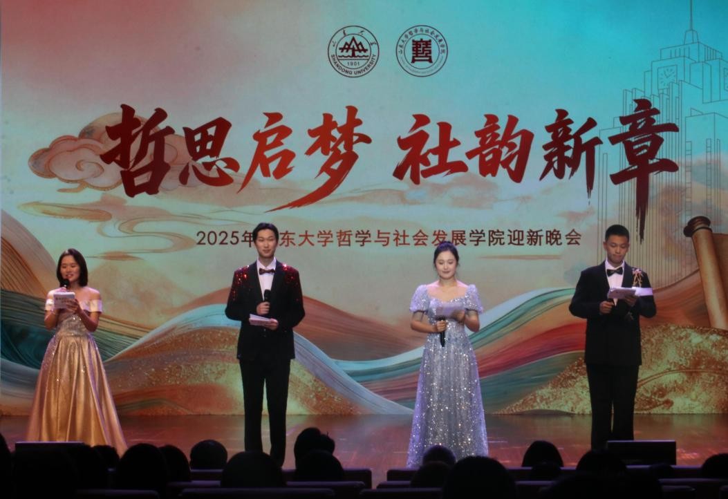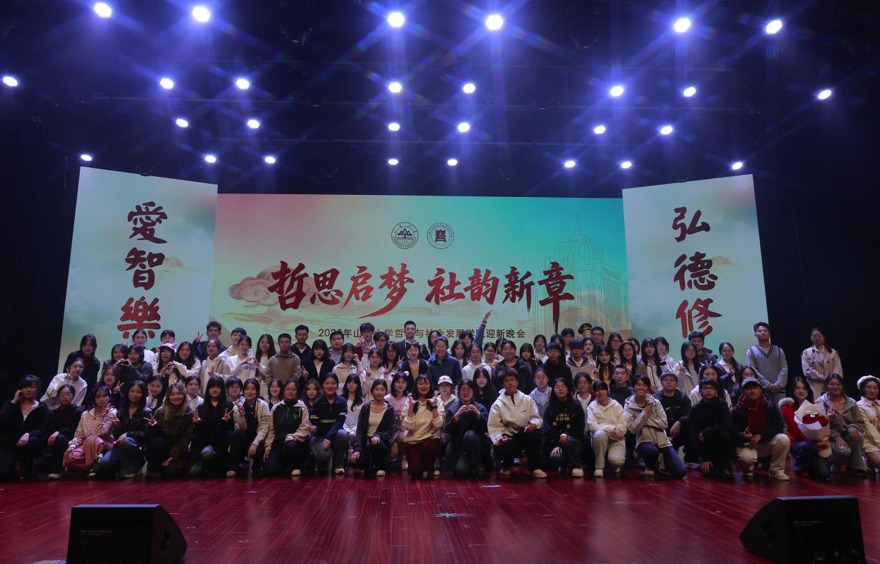 晚会最后,易学与中国古代哲学研究中心李秋丽老师,社会学系助理研究员王元超老师,与24级本科生李心怡、25级本科生崔书侨及全体演职人员共同唱响《我的山大我的家》,熟悉的旋律将家的概念温暖定格,为晚会画上了圆满句号。