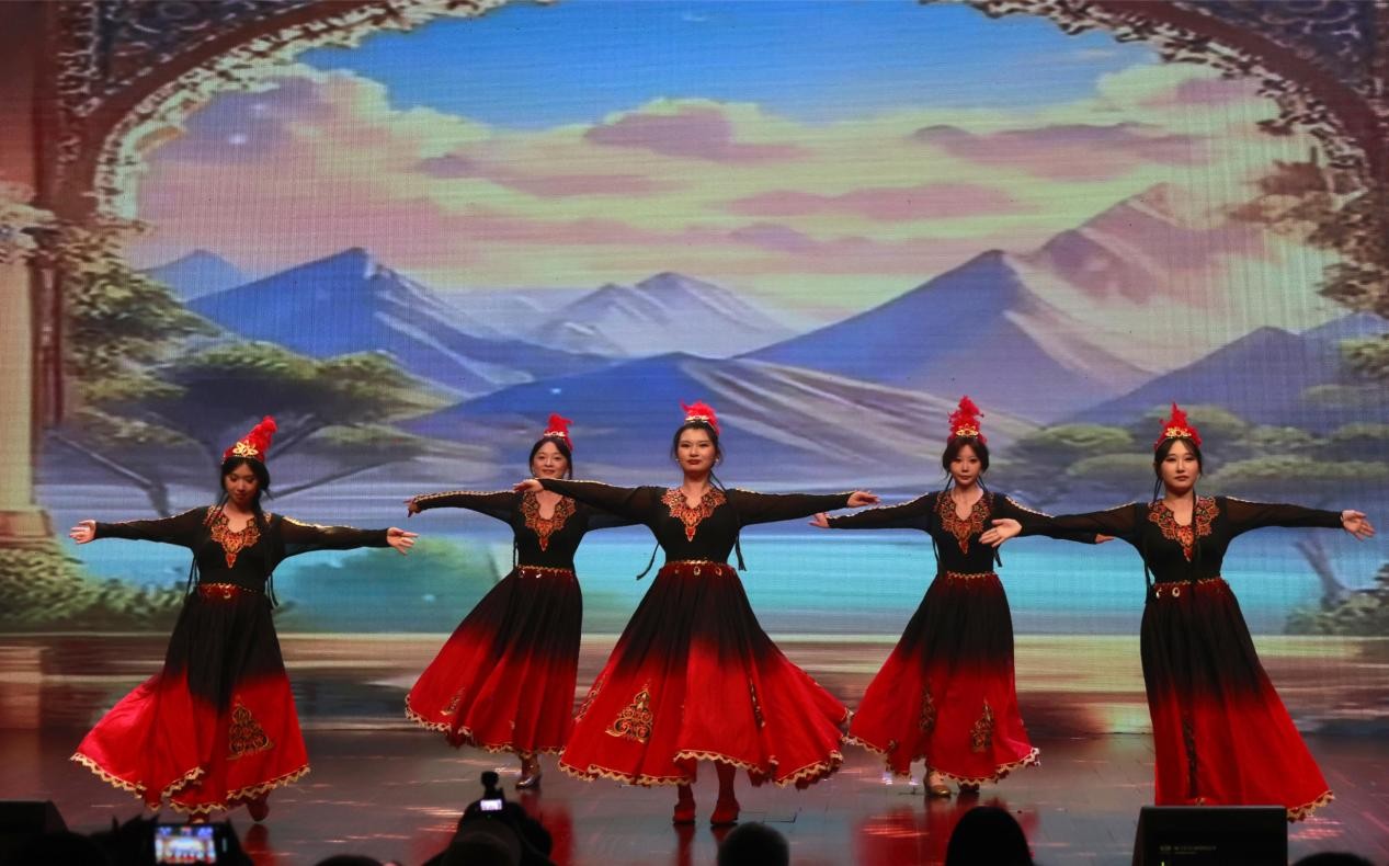 25级本科生娜则莱等表演的新疆舞《石榴花开》,以鲜明特色诠释了民族团结。