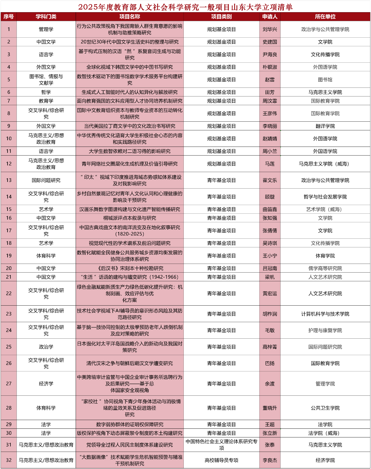 近日,教育部社会科学司公布了2025年度教育部人文社会科学研究一般项目立项结果。beat365英国官方网站共获批32项,在规划基金、青年基金、自筹经费项目,西部和边疆地区项目、新疆项目、西藏项目等各类别立项中,beat365英国官方网站获批30项,立项数位列全国高校并列第一,连续三年保持全国首位。