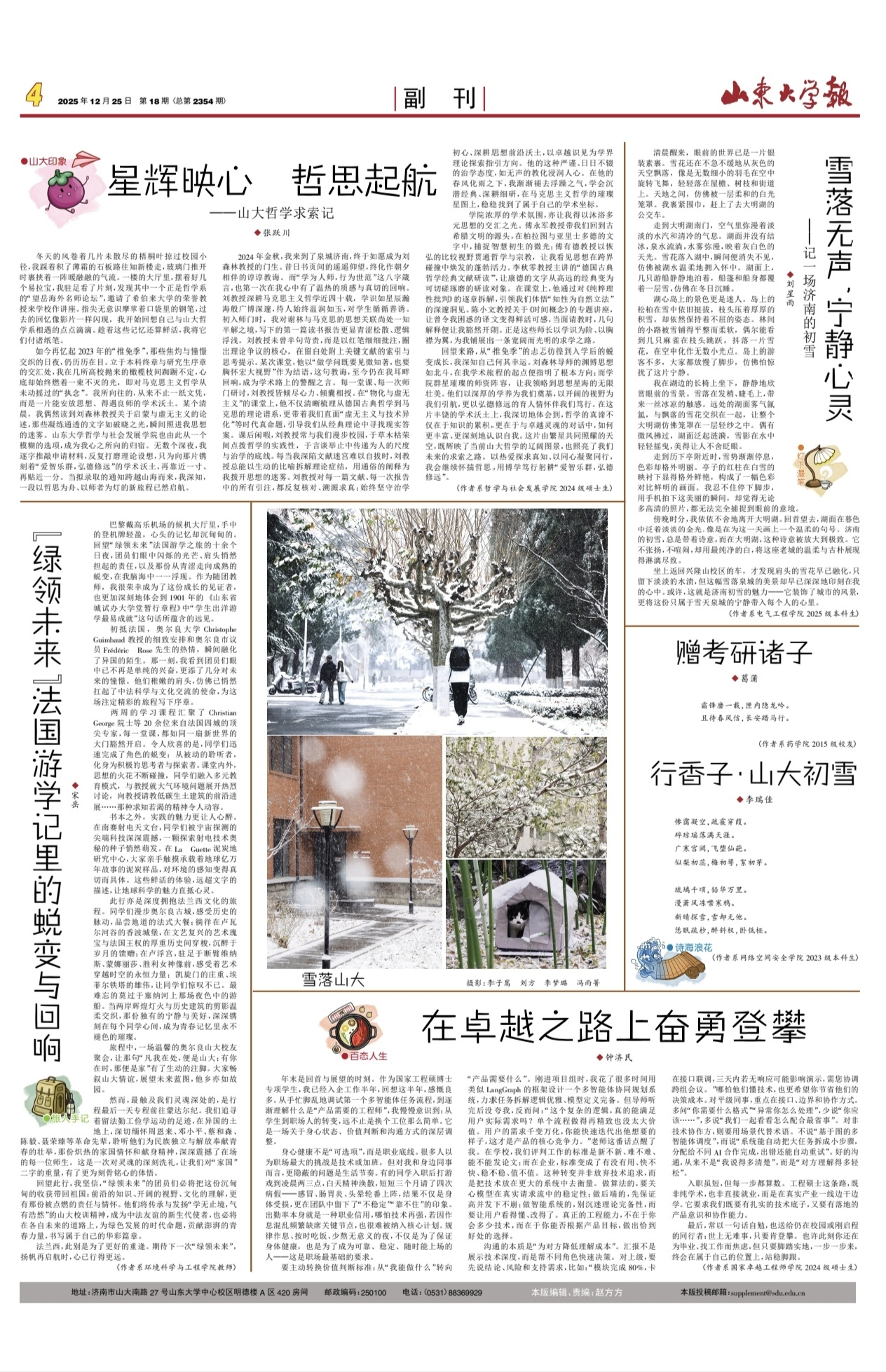 近日,beat365英国官方网站2024级硕士研究生张跃川在《beat365英国官方网站报》文艺副刊发表了题为《星辉映心,哲思起航——山大哲学求索记》的文章。文章生动回顾了作者从推免选拔到进入beat365英国官方网站哲学系求学的心路历程,展现了一名青年学子在学术沃土中的思想成长与精神追寻。
