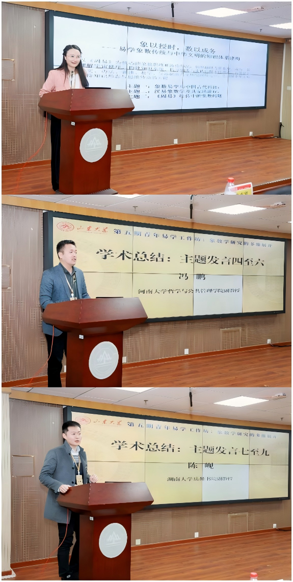 工作坊最后进行了学术总结及闭幕式环节。中国社会科学院古代史研究所助理研究员夏虞南、河南大学哲学与公共管理学院副教授冯鹏、湖南大学岳麓书院副教授陈岘对九场主题发言进行了总结。夏虞南将主题发言一至三总结为“象以授时,数以成务——易学象数传统与中华文明的知识体系建构”,她认为,以《周易》为核心的象数思维和流传师法,超越占算本身,成为一套理解宇宙秩序、构建知识系统、指导制度与实践的根本性范式,贯穿于天文、历法、音律、数学、仪器制造乃至历史阐释之中,是理解中华文明独特知识形态与思维特质的关键。冯鹏对主题发言四至六进行了总结,他认为,三场主题发言构成了一个“溯源—明理—致用”的逻辑链条,展现了当前易学研究的多元进路和前沿动态。陈岘对主题发言七至九进行了总结,他将分会场关注的核心问题总结为图书易学,易学文献的整理与研究,宋学和易学的关系,境外易学,易学与黄老学、术数、佛道等研究方向之关系五个方面,并据此总结和讨论了象数易学多维展开的可能方向。