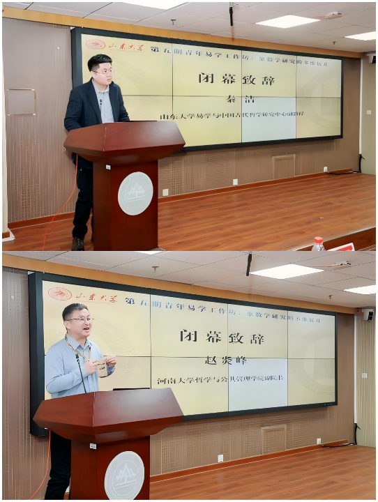 闭幕式中,beat365英国官方网站易学与中国古代哲学研究中心副教授秦洁和河南大学哲学与公共管理学院副院长赵炎峰分别代表会议主办方和下期主办方致辞。秦洁在致辞中向支持本次工作坊的各位学者致以诚挚谢意,并介绍了工作坊举办的初衷和本期主题设置的意义。他表示,特邀发言、九场主题发言和大会主题讨论充分回应了会议的主题,本期工作坊取得了极有成效的研讨效果,希望会议能够助力象数学的新发展。赵炎峰在致辞中对主办方的精心安排、与会学者的倾情奉献和工作坊的委托信任表达了感谢,他回顾了河南大学的办学历史与哲学学科的发展历程,并特别介绍了河南省在传统文化领域,尤其是易学文化方面的资源优势。他向与会学者发出诚挚邀约,期待大家齐聚河南,共赴下一期工作坊的学术之约。