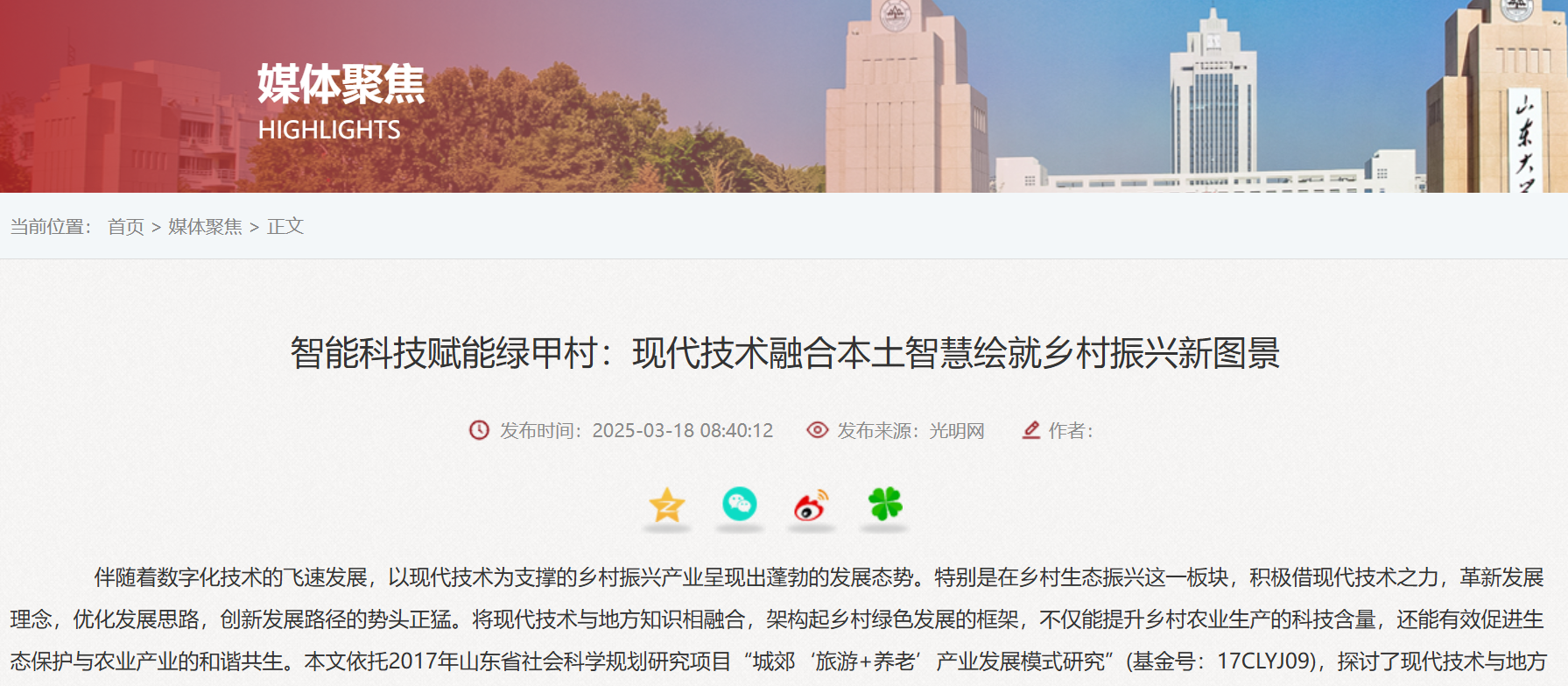 beat365英国官方网站人类学系副教授舒萍依托2017年山东省社会科学规划研究项目“城郊‘旅游+养老’产业发展模式研究”(基金号:17CLYJ09),探讨了现代技术与地方知识融合赋能乡村振兴的价值与路径,所撰写文章“智能科技赋能绿甲村:现代技术融合本土智慧绘就乡村振兴新图景”被光明网、山大视点媒体聚焦板块分别报道。