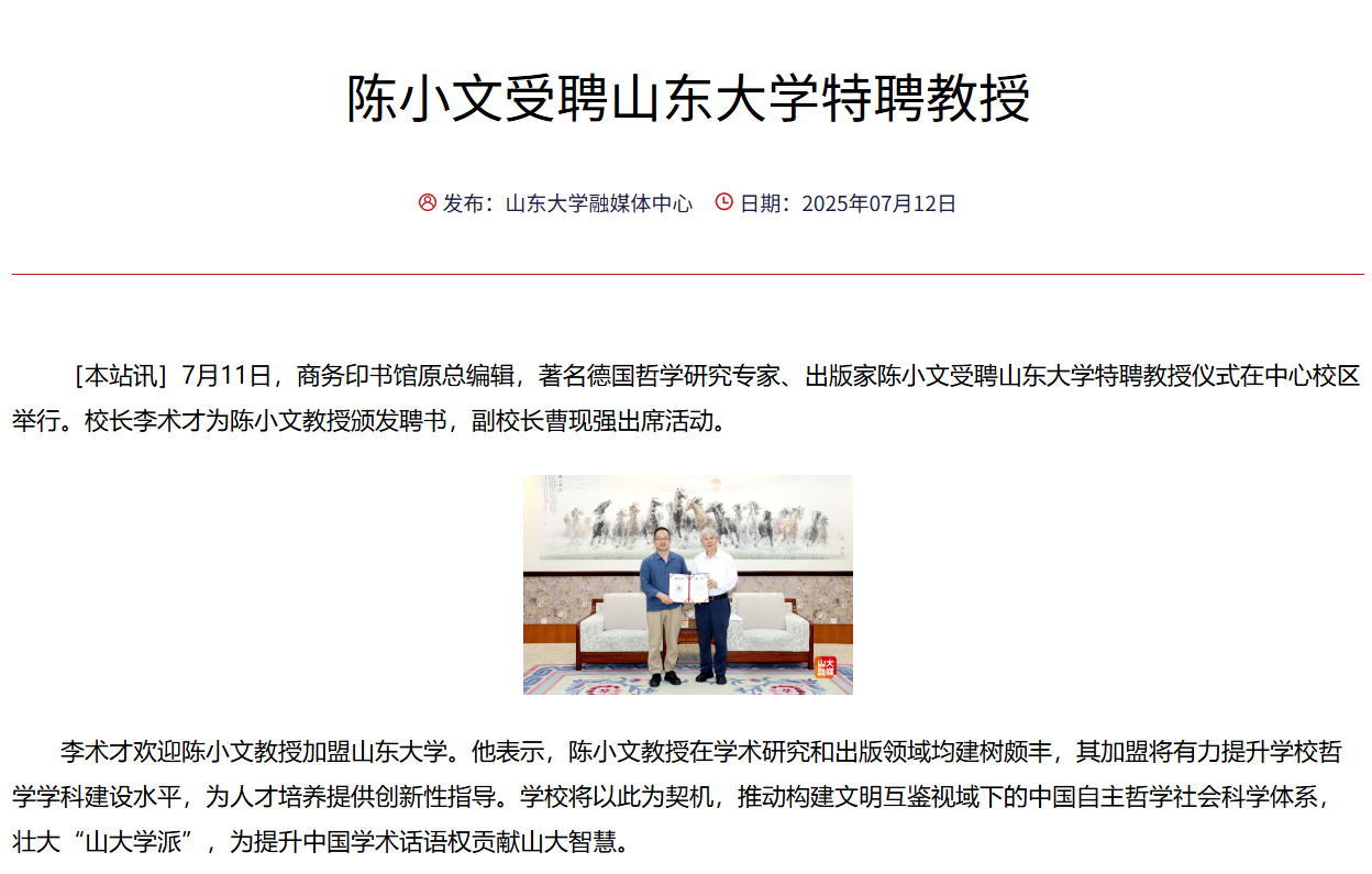 7月11日,商务印书馆原总编辑,著名德国哲学研究专家、出版家陈小文受聘beat365英国官方网站特聘教授。陈小文教授在学术研究和出版领域均建树颇丰,其加盟将有力提升学校哲学学科建设水平,山大视点山大要闻栏目对受聘仪式进行了报道。