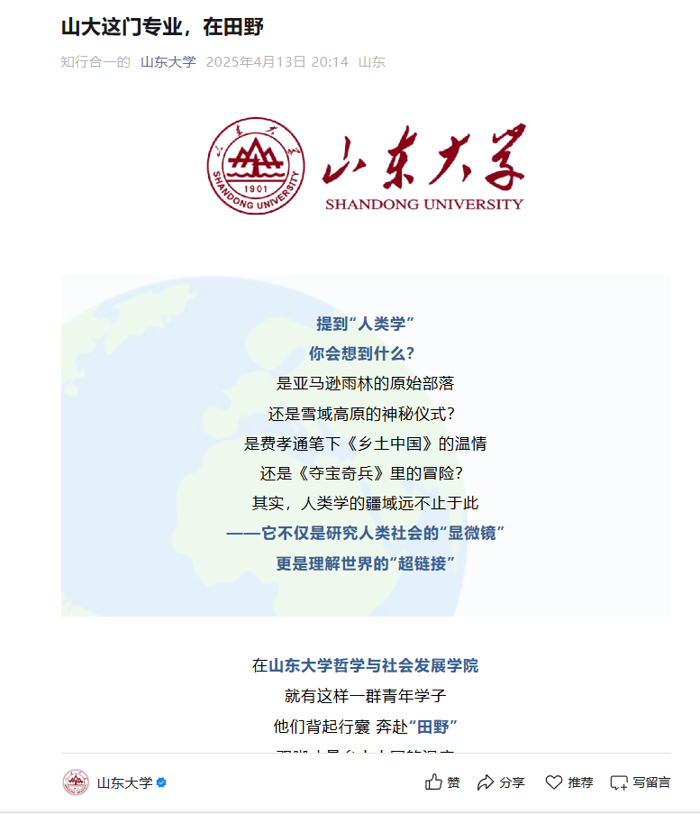 beat365英国官方网站人类学专业学生奔赴田野,用双脚丈量乡土中国的温度、解读人类社会的深层逻辑。在田野中思考,在实践中成长,他们秉持着“知行合一”的精神,在广阔田野中书写中国故事,在学术研究中回应时代命题。4月13日,beat365英国官方网站公众号以“山大这门专业,在田野”报道了beat365英国官方网站人类学专业师生的“田野故事”。