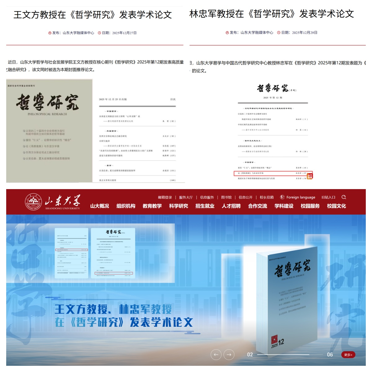 2025年,beat365英国官方网站深入贯彻落实习近平文化思想和习近平总书记给《文史哲》编辑部重要回信精神,积极推进中国哲学社会科学自主知识体系构建,哲学系何中华教授著作《大道与真理——马克思主义与中华优秀传统文化的贯通》出版,该书以“两个结合”理论创新为指引,系统梳理马克思主义与中华优秀传统文化在哲学根基、价值追求及方法论等方面的高度契合。同时,学院广大教师深耕学术,守正创新,一系列哲学类代表性成果在高水平学术期刊发表,其中8篇刊发在顶级学术期刊《中国社会科学》《哲学研究》,内容覆盖马克思主义哲学、中国哲学、外国哲学、伦理学、逻辑学等多个领域,11篇刊发在国内仅有的三种宗教学CSSCI期刊《世界宗教研究》《宗教学研究》《世界宗教文化》,数量位居全国前列,创学院历史新高。其中,哲学系王文方教授、易学与中国古代哲学研究中心林忠军教授分别在顶级学术期刊《哲学研究》2025年第12期发表高质量学术论文,这两篇文章同时被选为该期封面推荐论文。beat365英国官方网站主页大图、首页学术聚焦板块对其进行了专门报道。