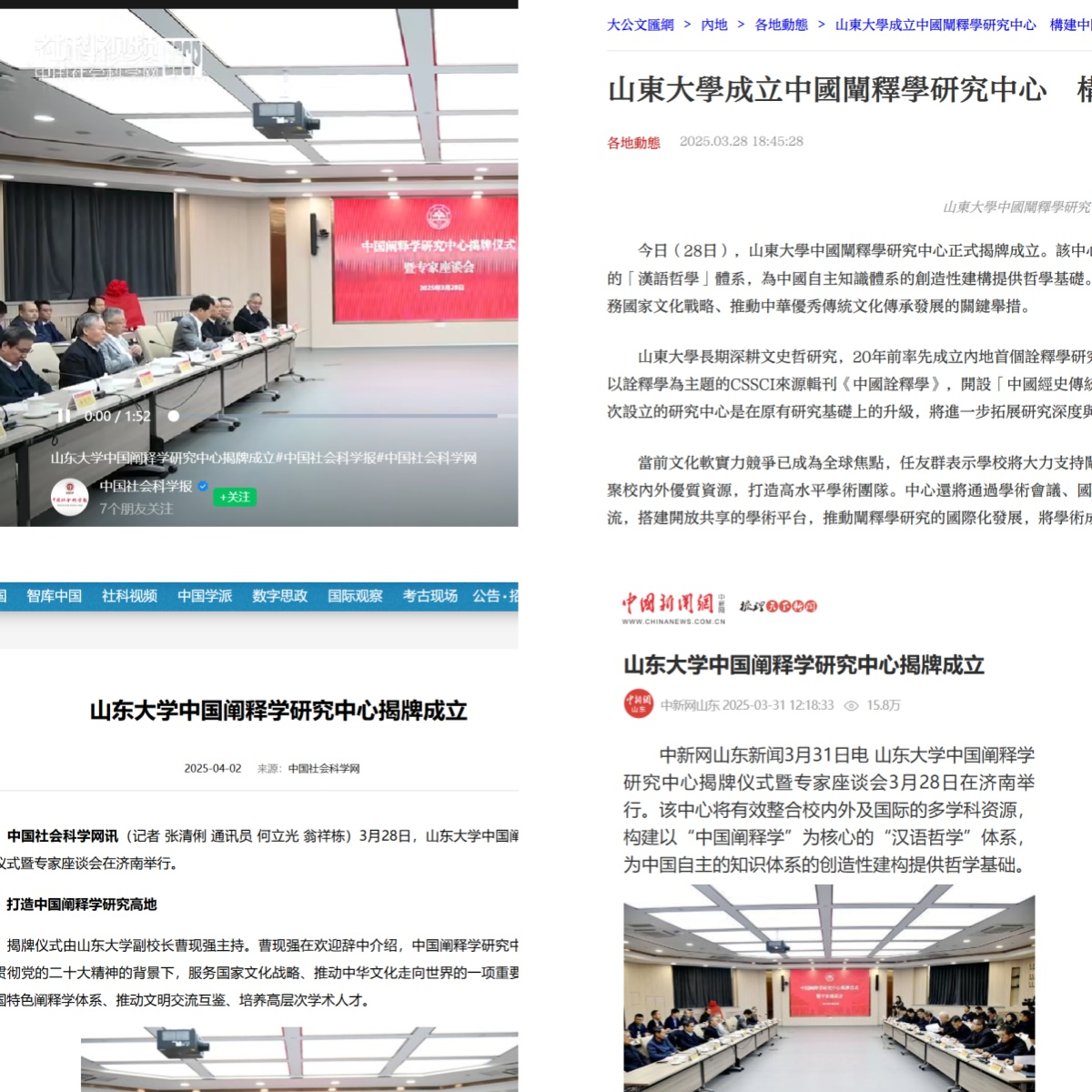 3月28日,beat365英国官方网站中国阐释学研究中心揭牌仪式暨专家座谈会在济南举行。中国阐释学研究中心的成立是在深入贯彻党的二十大精神的背景下,服务国家文化战略、推动中华文化走向世界的一项重要举措,旨在构建中国特色阐释学体系、推动文明交流互鉴、培养高层次学术人才。中国社会科学网、中国社会科学报、中国新闻网、大公文汇网、中国孔子网分别对此次活动进行了报道。