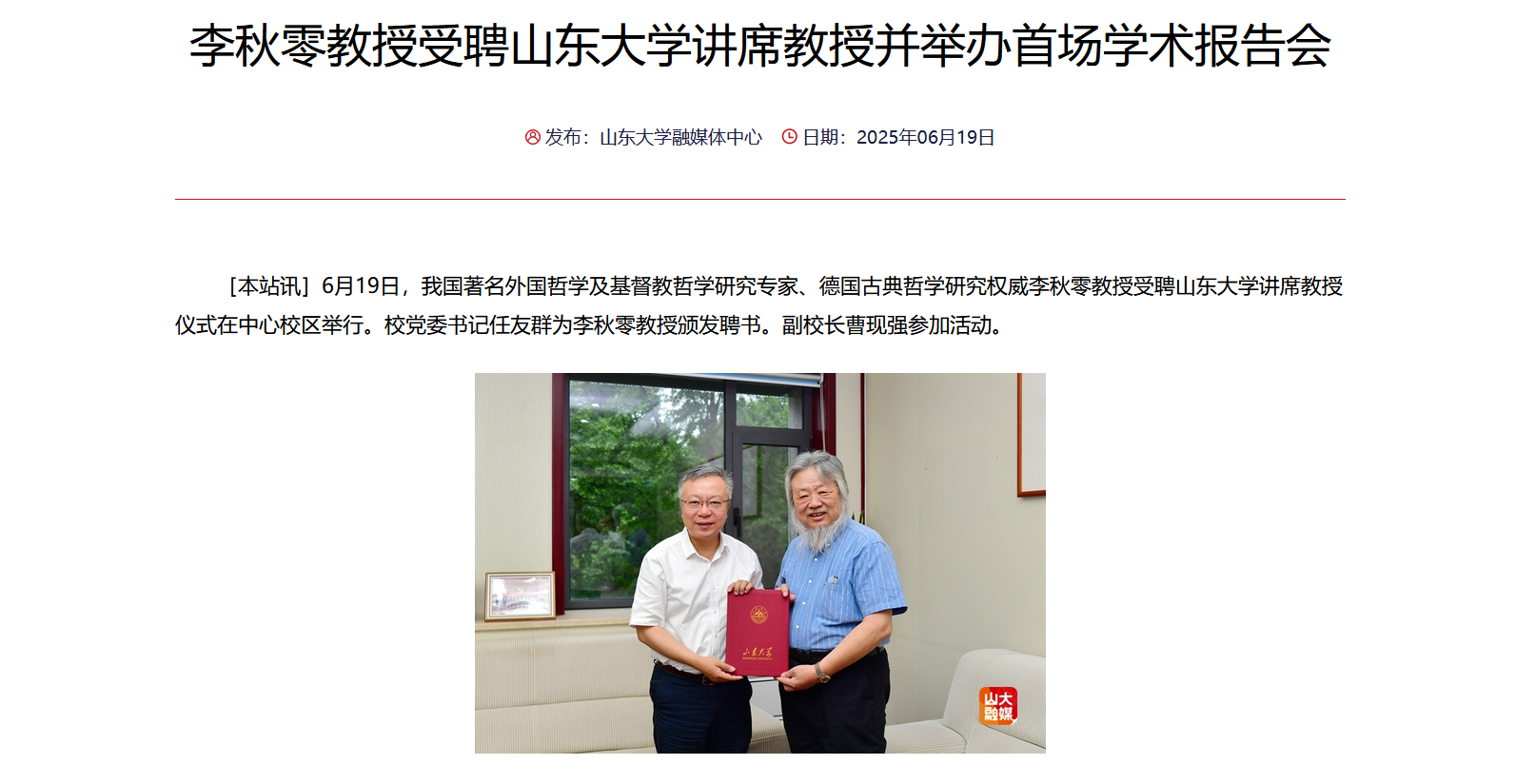 6月19日,我国著名外国哲学及基督教哲学研究专家、德国古典哲学研究权威李秋零教授受聘beat365英国官方网站讲席教授,并做客文渊讲堂作首场学术报告会。山大视点山大要闻栏目对受聘仪式及学术报告会进行了报道。