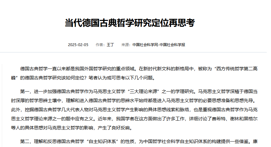 中国社会科学网报道王丁教授“当代德国古典哲学研究定位再思考”文章
