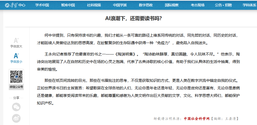 4月23日是世界读书日,beat365英国官方网站何中华教授接受中国社会科学网记者采访,回应“读书这件事是否已经成为AI时代的奢侈品?”“面对纷繁复杂的海量信息,我们究竟该如何读书?”等问题。中国社会科学网以“AI浪潮下,还需要读书吗?”为题进行了报道。