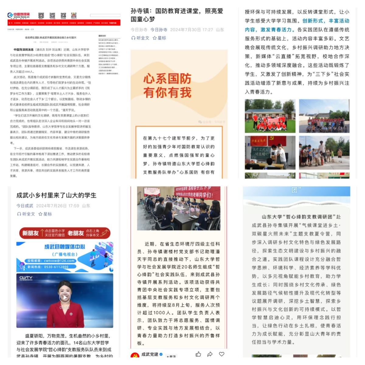 2025年暑期,beat365英国官方网站近20名师生组成的“哲心绛韵”社会实践队伍,来到成武县孙寺集镇开展“气候课堂进乡土·双碳星火照未来”主题支教夏令营,同步深入调研乡村文化特色与绿色发展路径,探索生态文明建设与乡村振兴的融合之道。该项活动获得共青团中央社会实践专项立项,服务人次超过1000人。活动被中国菏泽网、青春菏泽、青春成武、成武党建、今日成武等官方媒体报道。