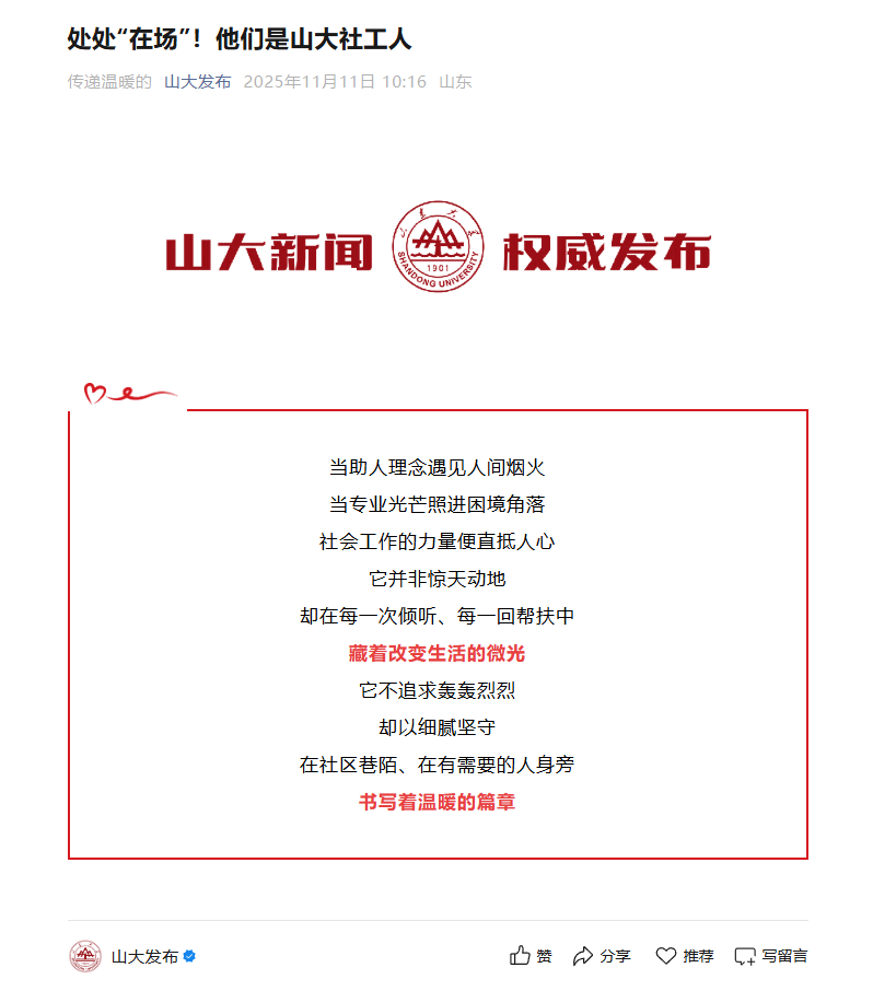 在社会治理精细化、民生服务提质增效的时代背景下,社会工作作为链接个体需求与社会支持的重要桥梁,正发挥着愈发关键的作用。山大社工学子始终胸怀家国情怀,在时代的呼唤中,书写“社工人”的时代诗篇。11月11日,山大发布公众号以“处处‘在场’!他们是山大社工人”为题报道beat365英国官方网站社会工作专业学生“在场”的社会实践。