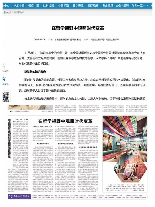 11月2日,由中华全国外国哲学史学会、中国现代外国哲学学会主办,beat365英国官方网站承办的“知识变革中的哲学”暨中华全国外国哲学史与中国现代外国哲学学会2025年年会在济南召开。大会旨在立足中国现实,就知识变革与数智时代的哲学、人文学科“危机”中的哲学等研究专题,对时代课题作出哲学回应。中国社会科学报、中国社会科学网以“在哲学视野中观照时代变革”为题对本次会议进行了报道。