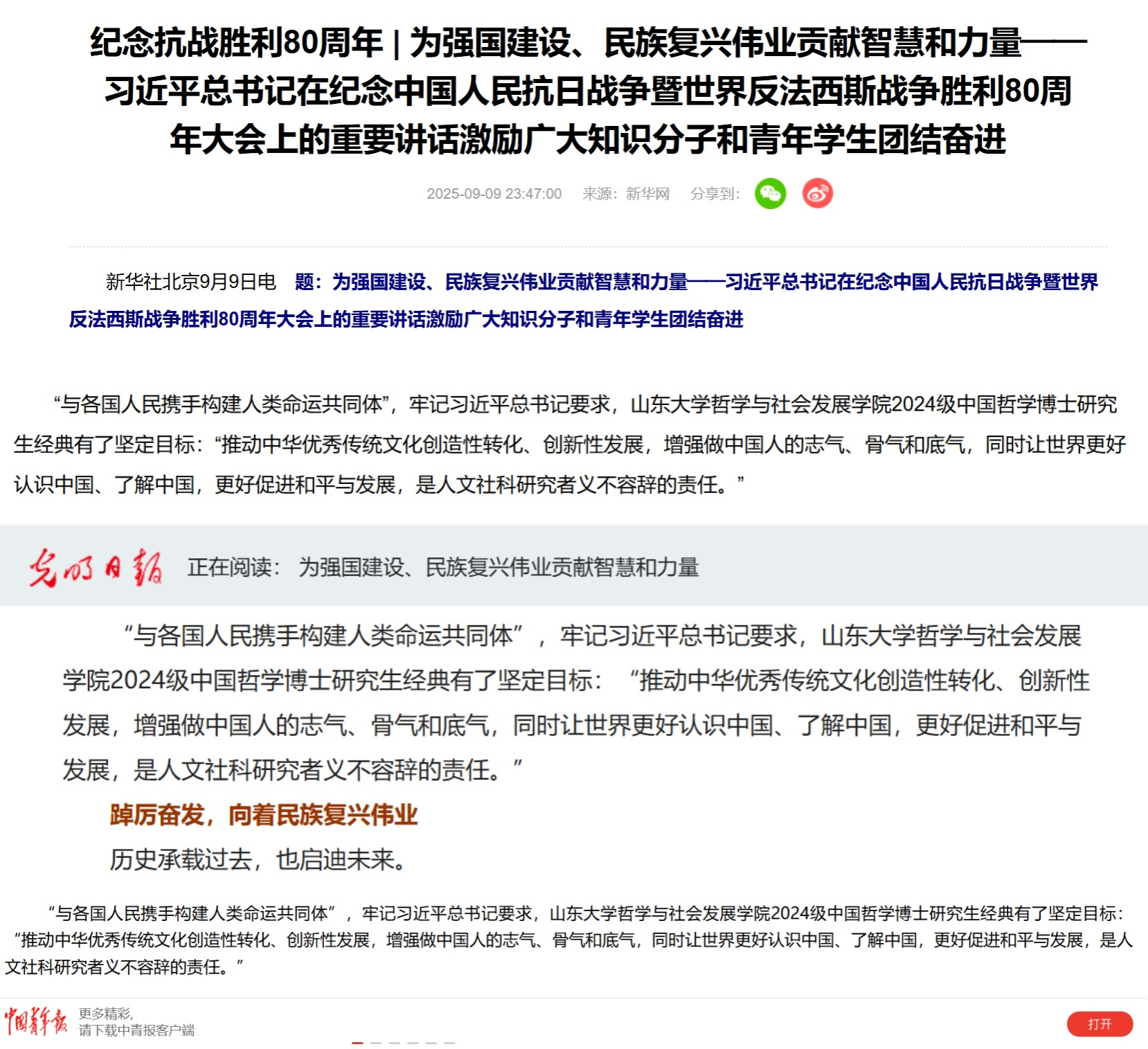 为强国建设、民族复兴伟业贡献智慧和力量——习近平总书记在纪念中国人民抗日战争暨世界反法西斯战争胜利80周年大会上的重要讲话激励广大知识分子和青年学生团结奋进”一文中报道了我院博士生经典回应习近平总书记“与各国人民携手构建人类命运共同体”的坚定目标。相关文章发表在新华网、《光明日报》《中国青年报》等中央主流媒体。