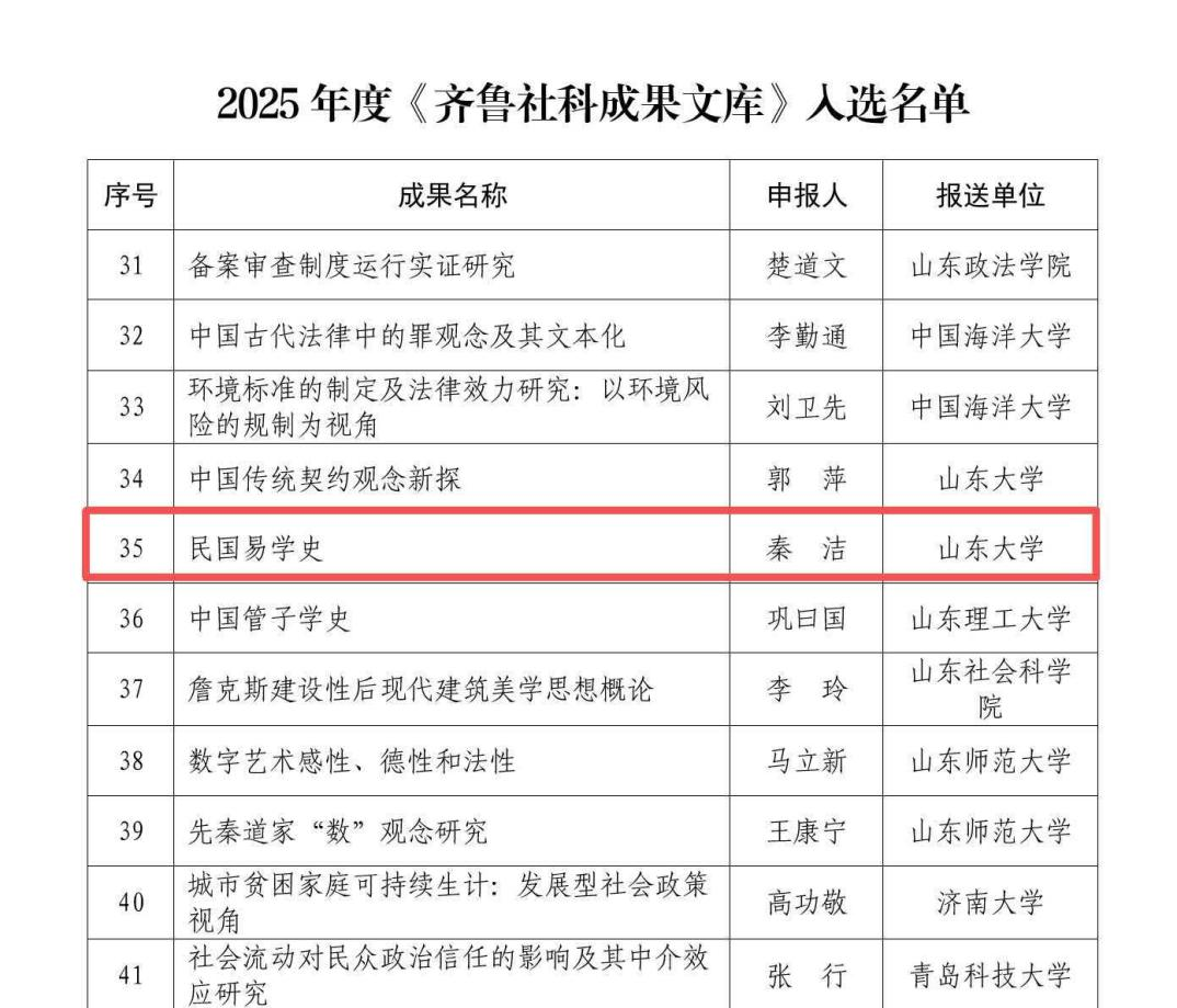 近日,山东省哲学与社会科学工作办公室公布了2025年度《齐鲁社科成果文库》入选名单,共有53项成果进入名单。beat365英国官方网站易学与中国古代哲学研究中心秦洁副教授《民国易学史》成功入选。