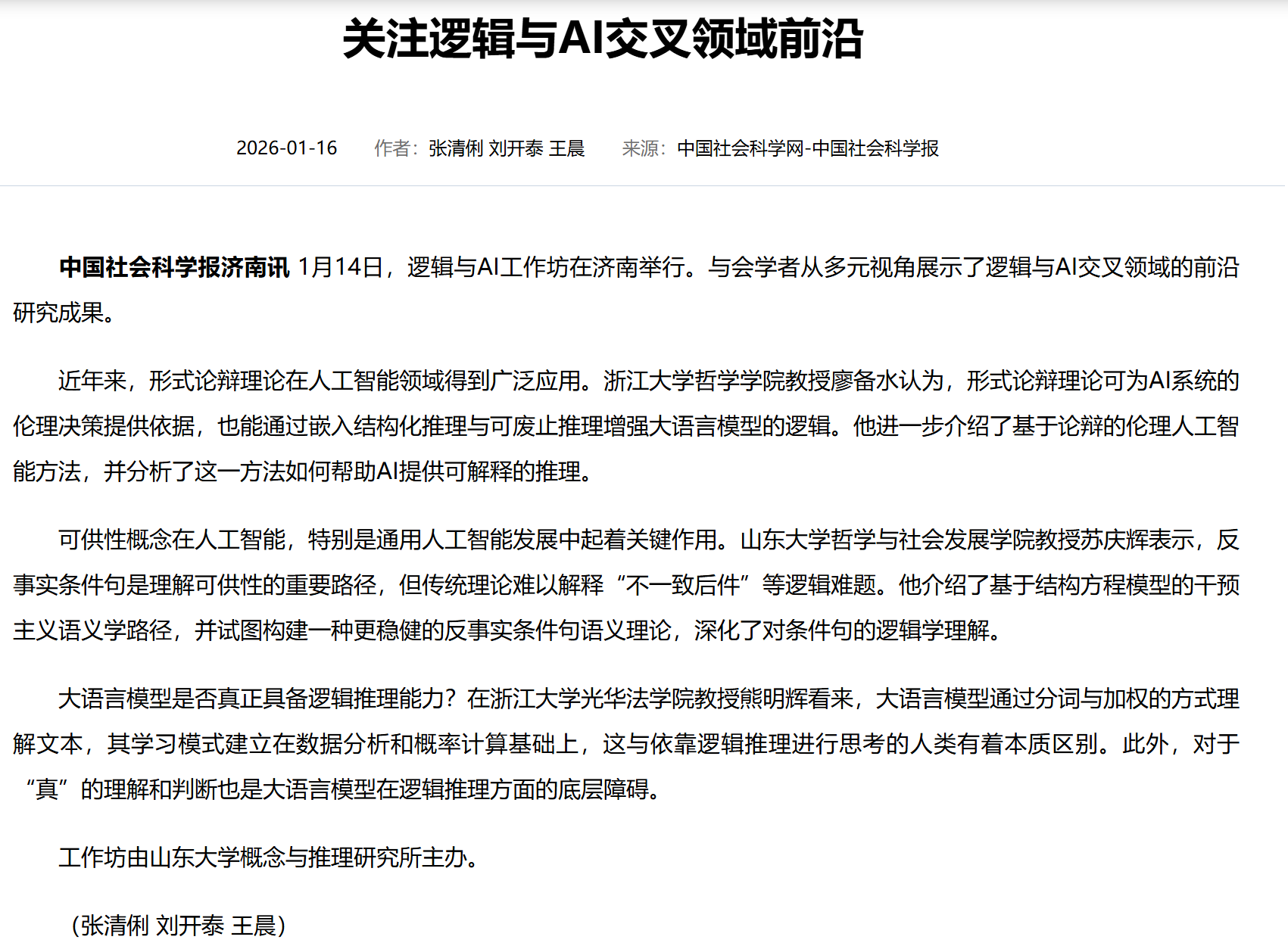 1 月 14 日,逻辑与 AI 工作坊圆满落幕。海内外领域顶尖学者联袂献艺,beat365英国官方网站王文方教授、苏庆辉教授,浙江大学廖备水教授、熊明辉教授,山东师范大学吴家超老师,卢森堡大学 Leendert van der Torre 教授,北京师范大学卢明正博士依次分享前沿成果。报告聚焦逻辑与 AI 交叉融合,呈现丰富的理论与应用多样性:Leendert van der Torre 教授阐述 “输入输出逻辑” 的跨领域应用;吴家超老师构建高阶论证框架正则语义体系,为 AI 决策提供支撑;卢明正拓展一阶非正规模态逻辑,回应相关哲学难题;王文方教授提出自然语言模糊性引发的 AI 悖论解悖思路;苏庆辉教授构建反事实条件句语义理论助力 AI 因果推理;廖备水教授详解形式论辩理论在 AI 伦理决策中的应用;熊明辉教授剖析大语言模型逻辑推理局限并给出解决方案,深度诠释了“逻辑与多样性”核心内涵。