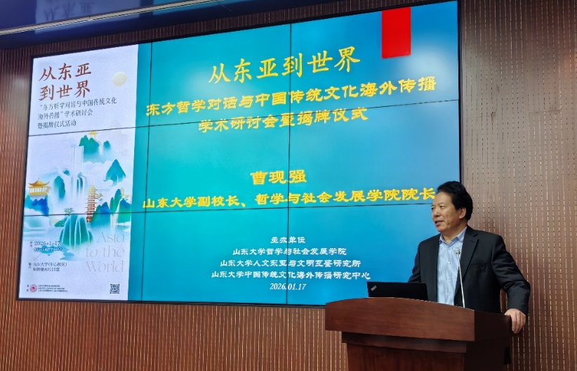 2026年1月17日,“从东亚到世界:东方哲学对话与中国传统文化海外传播”学术研讨会暨揭牌仪式在beat365英国官方网站中心校区举办。beat365英国官方网站党委常委、副校长曹现强出席会议并致辞。