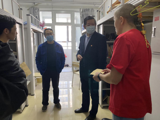 在走访过程中,学院一行尤其关注2020届毕业年级留校学生。在此次疫情中,毕业年级的升学、出国出境和就业工作都受到了直接影响,部分学生产生了焦虑、迷茫等情绪。加之留校期间因长时间隔离,更是容易产生孤独、烦闷等情绪。郑倩对同学们进行了鼓励,鼓励同学们沉下心来,稳住情绪,一步一步完成毕业和就业事宜。并表示,学院会尽力拓宽就业渠道,全力为同学们做好毕业服务。