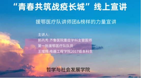 30日进行了援鄂医疗队讲师团&榜样的力量宣讲,齐鲁医院重症学科主管护师、第一批援鄂医疗队队员郭丙秀和电气工程学院2017级本科生王增辉主讲。宣讲会上郭丙秀向同学们介绍了自己的援鄂经历及感触以及与队友间温暖的故事,王增辉向同学们分享疫情期间自我成长的相关经验。