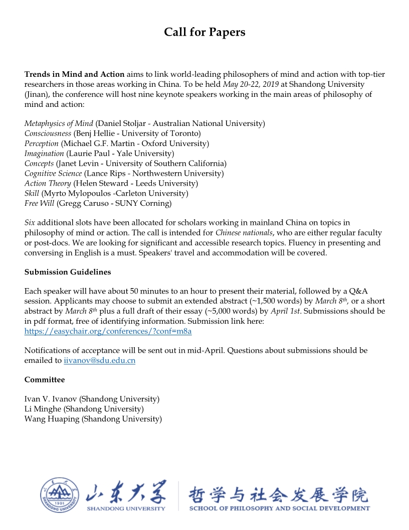 关于“心灵与行动哲学动向”国际会议征集会议发言人及论文的通知