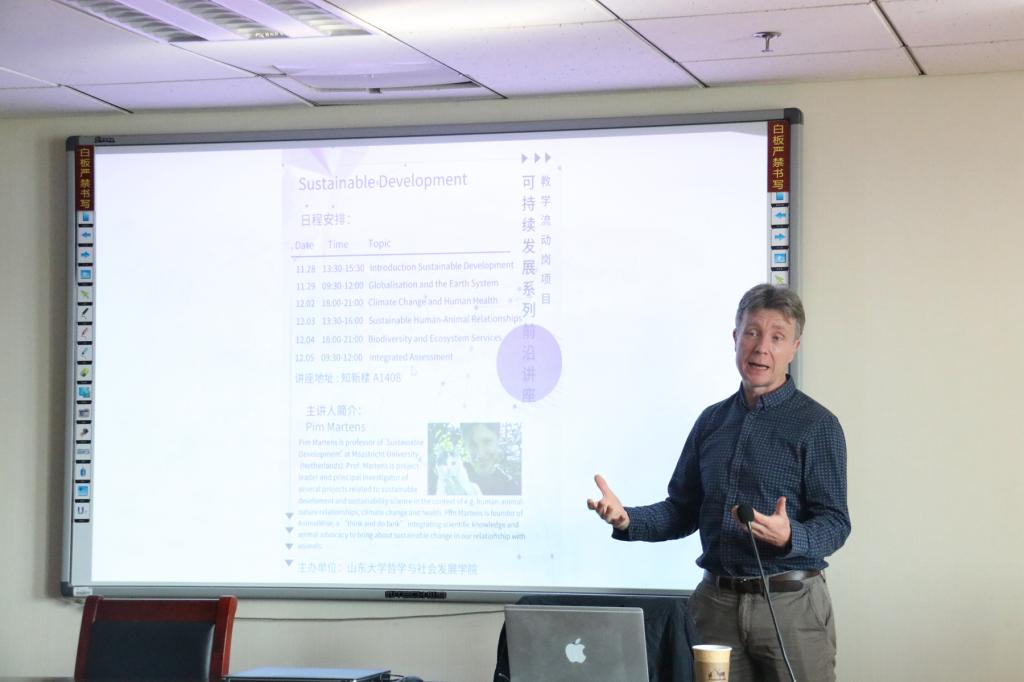 11月28日-12月5日,荷兰马斯特里赫特大学Pim Martens 教授做客beat365英国官方网站可持续发展系列前沿讲座,先后作了“可持续发展导入、人与动物关系、气候变化与人类健康、生物多样性与生态系统”等多个主题的报告,社会学系苏冰涛老师主持。