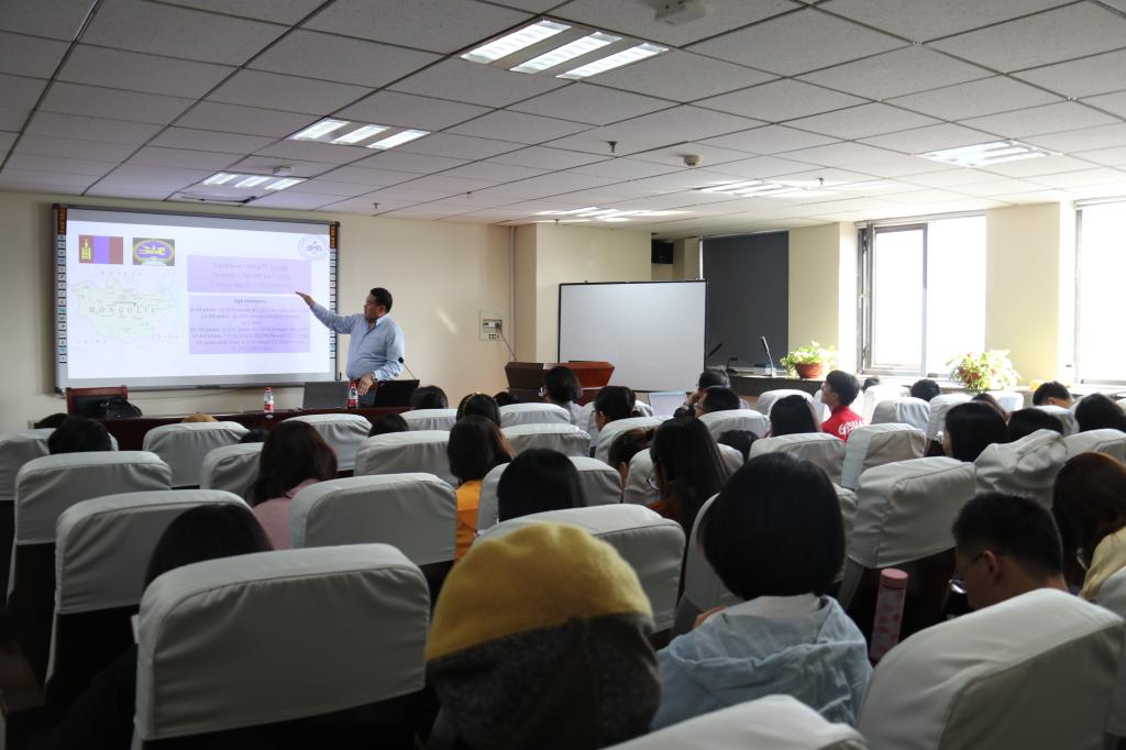 首先,Munkhbat教授从人口、国土面积以及年龄结构等方面介绍了蒙古国的基本概况。紧接着Munkhbat教授引用国际社会工作者协会的社会工作定义来解释社会工作的概念,并且强调社会工作的要义在于改变社会,解决人际关系问题,赋予人民权力和增进幸福感,要遵循社会公平和人民赋权的原则。Munkhbat教授与现场同学就社会工作是职业还是学科进行了互动,他本人更倾向于社会工作是一种职业,因其更注重实践性。接下来Munkhbat教授介绍了社会工作在蒙古的发展历程,主要分为四个阶段:前职业化阶段,主要指以传统家庭和社区为基础的社会福利服务;早期专业化阶段(1996-2000),此阶段蒙古开设了本科社会工作课程,社会工作的发展获得合法地位;能力建设阶段(2001-2006),该阶段增设了社会工作硕士生课程;制度化阶段(2007-现在),该阶段出现了大量社会工作出版物和社会工作组织。此外,Munkhbat教授总结了影响蒙古社会工作发展的四个主要因素,分别是:政治和意识形态因素、相关国际组织的影响、人文文化因素、个人背景因素。关于蒙古社会工作的教育制度及其挑战,Munkhbat教授以国立蒙古大学为例,介绍了社会工作专业的课程和学位设置,蒙古社会工作者的就业方向则主要是家庭及儿童权益的法律领域、公办或民间的社工组织。但是蒙古的社会工作者也面临着工作收入低、工作压力大、工作环境艰苦等挑战。