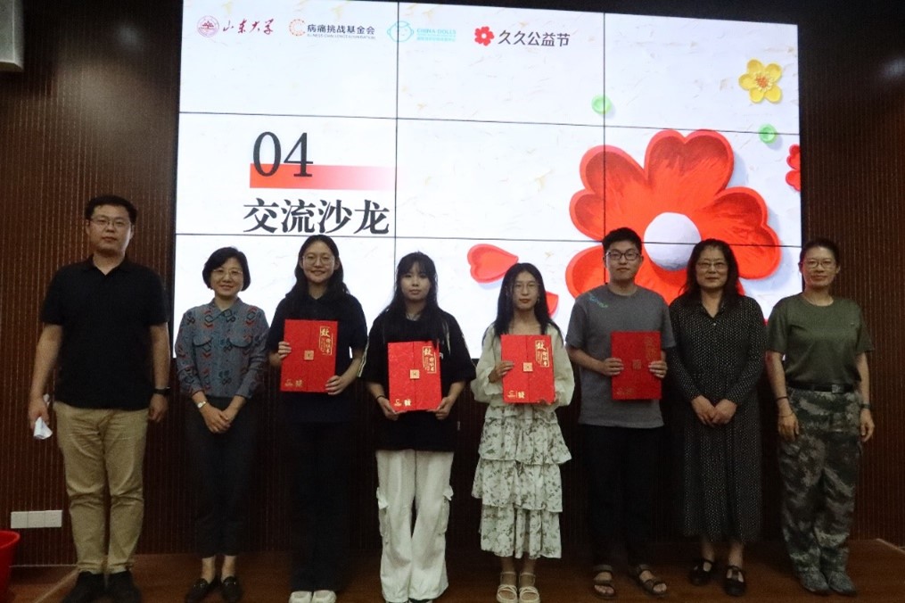 在观影会的尾声,beat365英国官方网站党委副书记马燕、翁祥栋,副教授张洪英及校友代表张皓宇先生,向参与筹备为爱呐“罕”系列活动的学生组织、学生公益团队颁发了荣誉证书。同时,北京病痛挑战公益基金会和济南瓷娃娃罕见病关爱中心在第40个教师节到来之际,与同学们一起为现场老师送上了最诚挚的祝福。