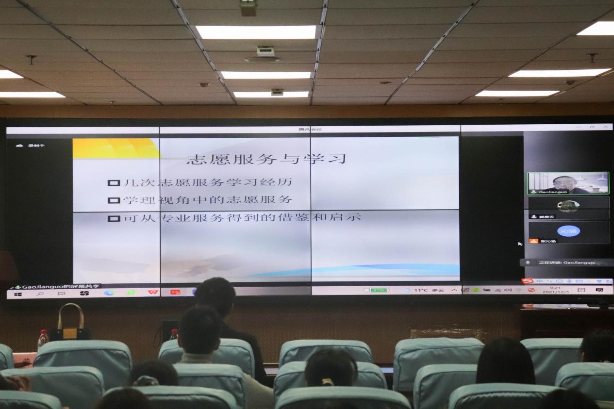 高鉴国教授借助腾讯会议进行线上授课。高鉴国结合社会工作系学生实习服务团队的志愿服务实例,从学理视角出发,依托社会工作实务通用过程模式、RE-AIM框架等专业理论知识,讲授志愿服务项目的开展与运营。理论与实践相结合的讲授让学员们从专业服务中收获借鉴和启示,从而更针对性地开展志愿活动,提升活动的质量与效果。