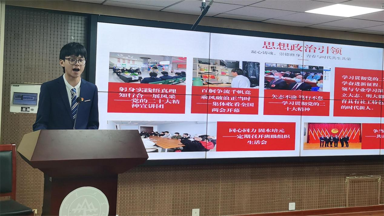 在答辩现场,27个班级的负责人按照抽签顺序依次进行班级答辩。首先,2020级毕业班的同学梳理了班集体三年来的成长轨迹与学习成果,向学弟学妹分享了班级组织建设经验,鼓励低年级班干部立足同学需求,以真诚付出提升服务效能,建设温馨班级共同体。随后2021、2022级学生骨干根据抽签顺序逐一展示了班级风采,各班立足专业特色,以班级结构建设、思想政治引领、五育兼修并举、成员成才赋能为线索,展现了求实创新的扎实学风和丰富多彩的班级成果。最后,2023级新生班委分享了班级成立以来的基本情况,并就班级建设目标提出了针对性的详细规划;他们表示未来将继续虚心向师长学习,在学科交融中博采众长,通过营造乐知乐学的团结氛围增强集体力量。答辩结束后,主持人吕奕涵做了简要总结,并鼓励各班在接下来的工作中不断探索创新班级管理建设方法,将班级打造成创优良学风、促全面发展的坚实阵地。