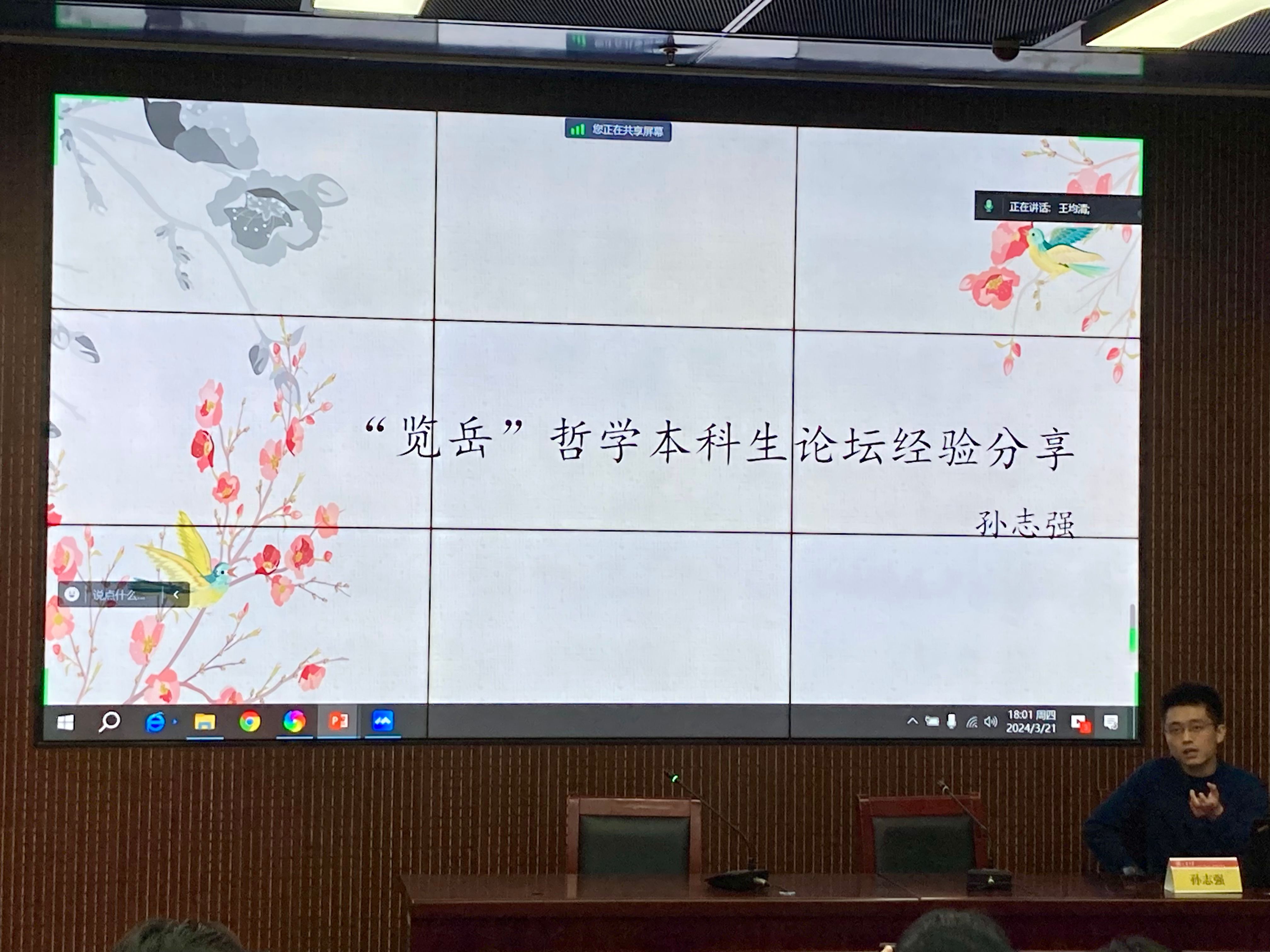 依托于“览岳”哲学本科生论坛所提供的学术平台,着眼于哲学专业本科学生学术兴趣的培养与引导,本次活动旨在鼓励并帮助年轻学生能够更早、更自觉地投身扎实深入的学术研究与规范化的学术训练当中,为日后进一步地提升学术能力与素养打下坚实基础。本次分享会大体上按照哲学专业的不同学科方向,分为五个板块依次进行。每一板块先由历届获奖学生发言:他们分别是中国哲学方向的王均清、汤云翔两位同学,外国哲学方向的王学庆同学,马克思主义哲学方向的孟德誉同学,宗教学方向的曹长瑞同学,以及逻辑学方向的李坤桓同学。每轮学生发言后,再由该学科方向的青年教师做出指导和分享。在此期间,师生们主要就论文规范写作、论文结构内容的设计安排、跨学科视野的正确认识、哲学原典与二手文献之间关系等诸多重要主题进行了交流和分享,为大家带来了一场精彩的学术盛会。