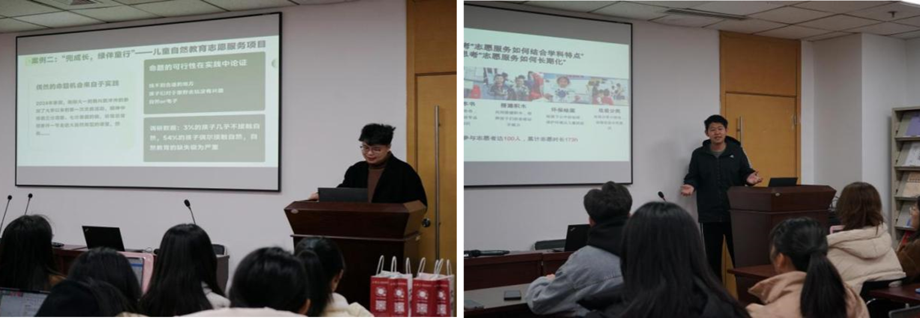 紧接着,“兜成长、绿伴童行”、点石成金——固废“垃圾”低碳“新生”项目、“乐智者”青少年哲学项目三支优秀志愿服务团队依次展开分享。“兜成长、绿伴童行”团队提出跨界融合达到创新的路径,并结合嫩苗计划项目的形成,强调实践是选题的土壤。点石成金——固废“垃圾”低碳“新生”项目团队则是结合“志愿调研—技术应用—服务跟踪”项目探索流程,表示哲社学子可发挥专业优势,聚焦前沿问题,以哲思社论提出切实而长期的服务方案。“乐智者”青少年哲学项目团队围绕项目背景、研发历程、项目模式、项目成果、社会价值、多方支持和未来规划七个方面详细介绍项目内容,引导同学们基于专业知识和实践经验,不断优化项目设计,打造精品品牌。