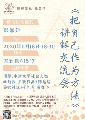 11月18日晚上,本期然登沙龙读书会以今年出版的新书——人类学家项飙与记者吴琦历时三年完成的谈话录《把自己作为方法》为主题书目,召开“《把自己作为方法》讲解交流会”。本期社会学沙龙邀请到人类学系的彭馨妍老师作为特邀参与嘉宾带领同学们就《把自己作为方法》,与来自beat365英国官方网站、历史学院、新闻传播学院、儒学高等研究院等不同学院、不同专业的研究生、本科生同学于beat365英国官方网站的研究生教室就书籍内容进行了讨论。