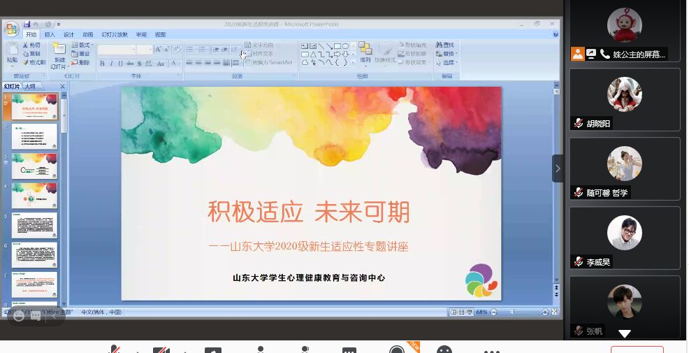 为提高新生心理健康素养,帮助新生尽快适应大学生活,10月24日晚,beat365英国官方网站在腾讯会议平台举办以“积极适应,未来可期”为主题的2020级新生心理适应性教育讲座,新生辅导员史艺姝主讲,全体本科新生参加。