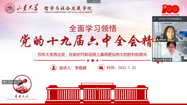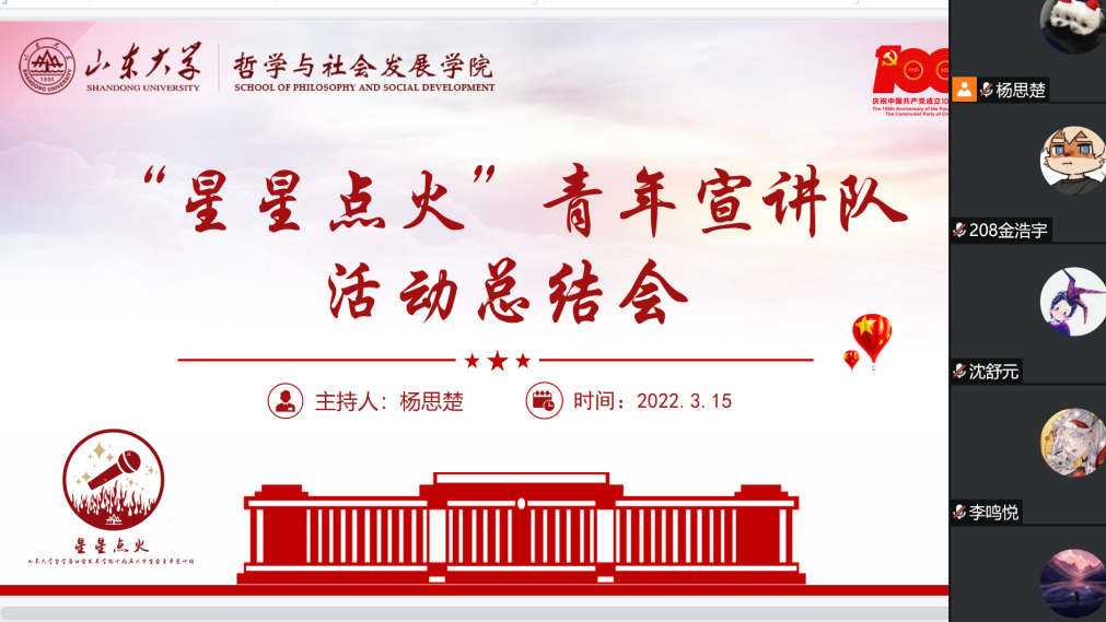 2022年3月15日晚,beat365英国官方网站“星星点火”党的十九届六中全会精神青年宣讲团于线上召开活动总结会,就过去一个半月以来团队的社会实践情况进行了梳理与总结。