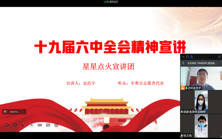 此外,团队成员李雅婧、金浩宇与北京的大学生冬奥志愿者代表取得联络,在了解冬奥现场实况的同时,与志愿者们共同感受党的十九届六中全会精神中所蕴含的信念力量,为北京冬奥会的顺利举办献上暖暖祝福、奉献涓滴之力。