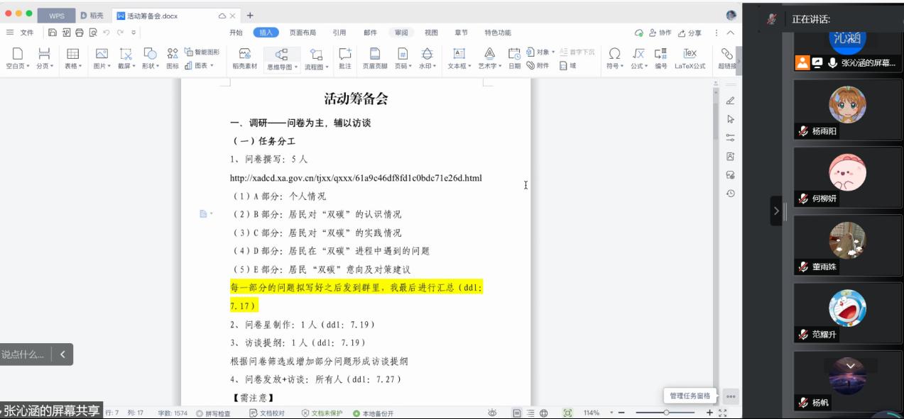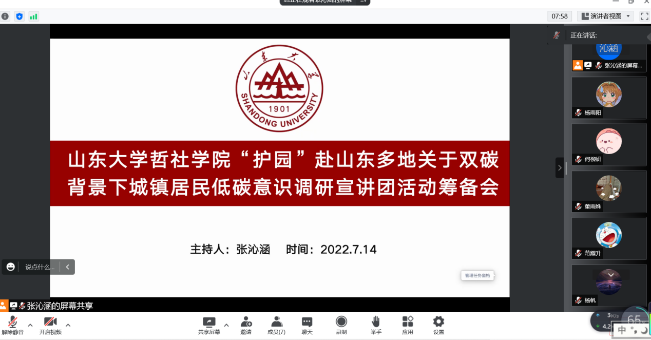 2022年7月14日晚8时,beat365英国官方网站“护园”赴山东多地关于双碳背景下城镇居民低碳意识调研宣讲团在腾讯会议上召开暑期社会实践活动筹备会。队长张沁涵主持,来自哲学、社会学、新闻学专业的6名团队成员参与。