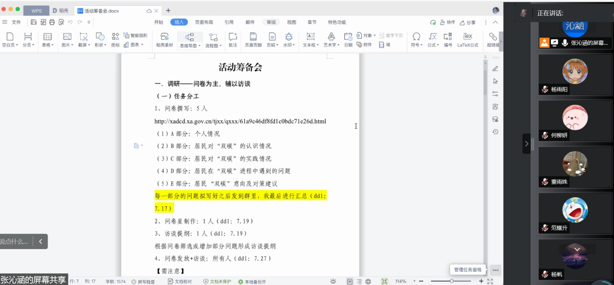本次调研分为前期筹备、中期实践、后期总结三个阶段,共历时18天。7月14日至19日,团队活动筹备工作有序开展。队长张沁涵主持召开活动筹备会,会议确定人员分工并对实践全过程的时间安排作出清晰规划,做到分工明确、扬长避短,为调研工作的顺利开展奠定良好的基础。针对调研工作,团队选取问卷调查和半结构式访谈相结合的调查方法,以提高调研的广度与深度。围绕城乡居民的“双碳”认知与落实情况,团队有条不紊地开展问卷设计、问卷星制作、访谈提纲撰写等调研准备工作,活动筹备阶段进展顺利。