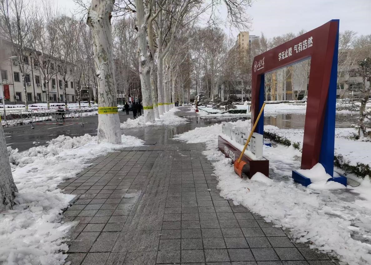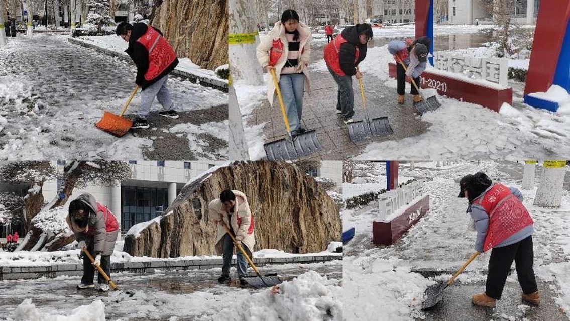 当日上午10时,志愿者们热情高涨,不畏严寒,迅速投入到扫雪除冰工作中。他们手持铁锹、扫帚等工具,分工明确,配合默契,对知新楼前道路的积雪和冰冻进行集中清理。经过数小时的持续努力,知新楼前主要通勤道路的积雪与冰冻基本清除完毕,为师生开辟出安全通道,有力保障了校园内的出行安全。
