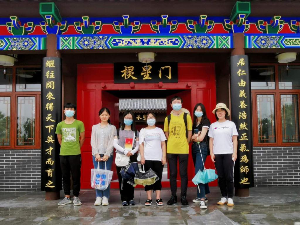谈话过后,孟庆恩与队员们进行合影。队员们接下来去参观了孟子学院。学院外绿树葱葱,空气清新,设有富有特色的孟东村文化标识。学院内仿制古建筑,古色古香,颇有文化气韵。