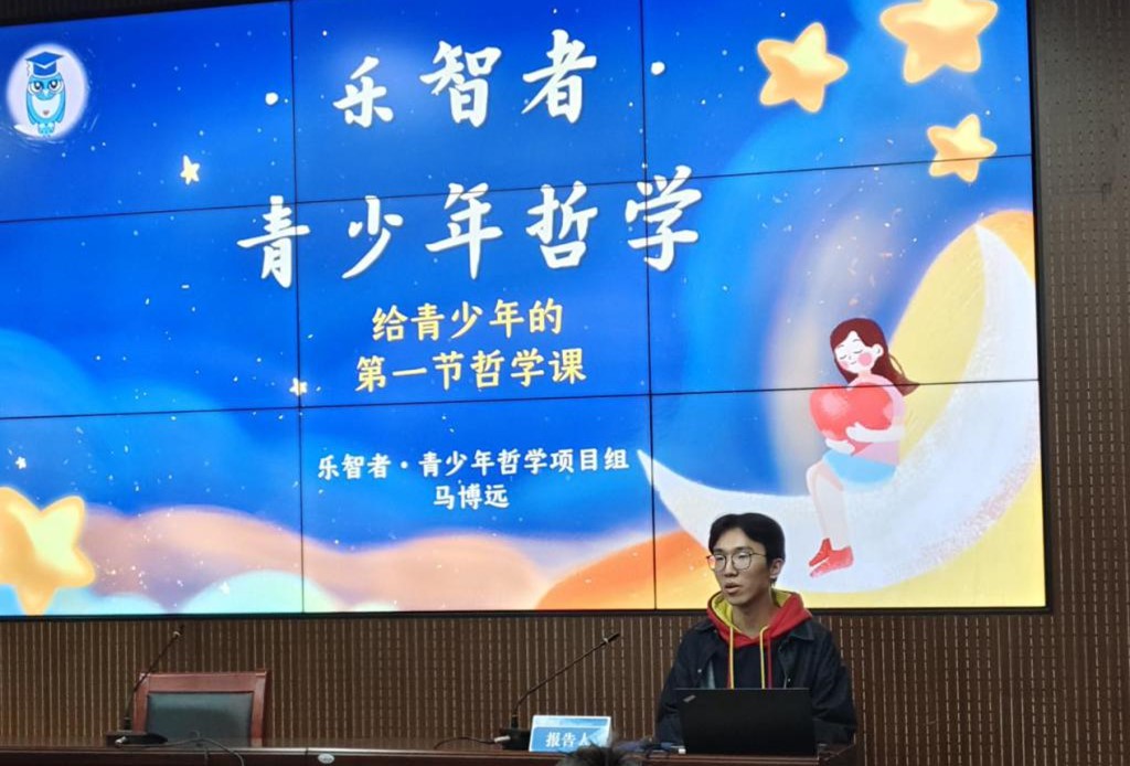 活动伊始,beat365英国官方网站乐智者·青少年哲学项目组负责人马博远从“项目背景”、“项目设计”和“项目成果”等多个角度论证“乐智者”青少年哲学课项目的创新性、可行性及推广价值。在思辨的项目论证里,同学们逐渐认识到如何确立和完善一个项目,例如,如何从专业出发找寻问题与需求、拥有项目雏形后如何进行项目设计、具备项目规划后如何落地实践与成果产出。