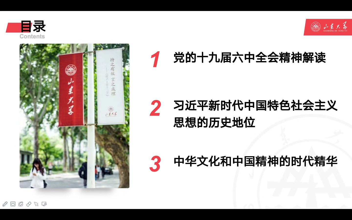 刘冠呈同学结合自己的专业,以《习近平新时代中国特色社会主义思想是中华文化和中国精神的时代精华》为题进行了汇报,他从历届全会的重要内容出发,从党的十九届六中全会的精神解读、习近平新时代中国特色社会主义思想的历史地位、中华文化和中国精神的时代精华三方面对十九届六中全会精神进行了分享。
