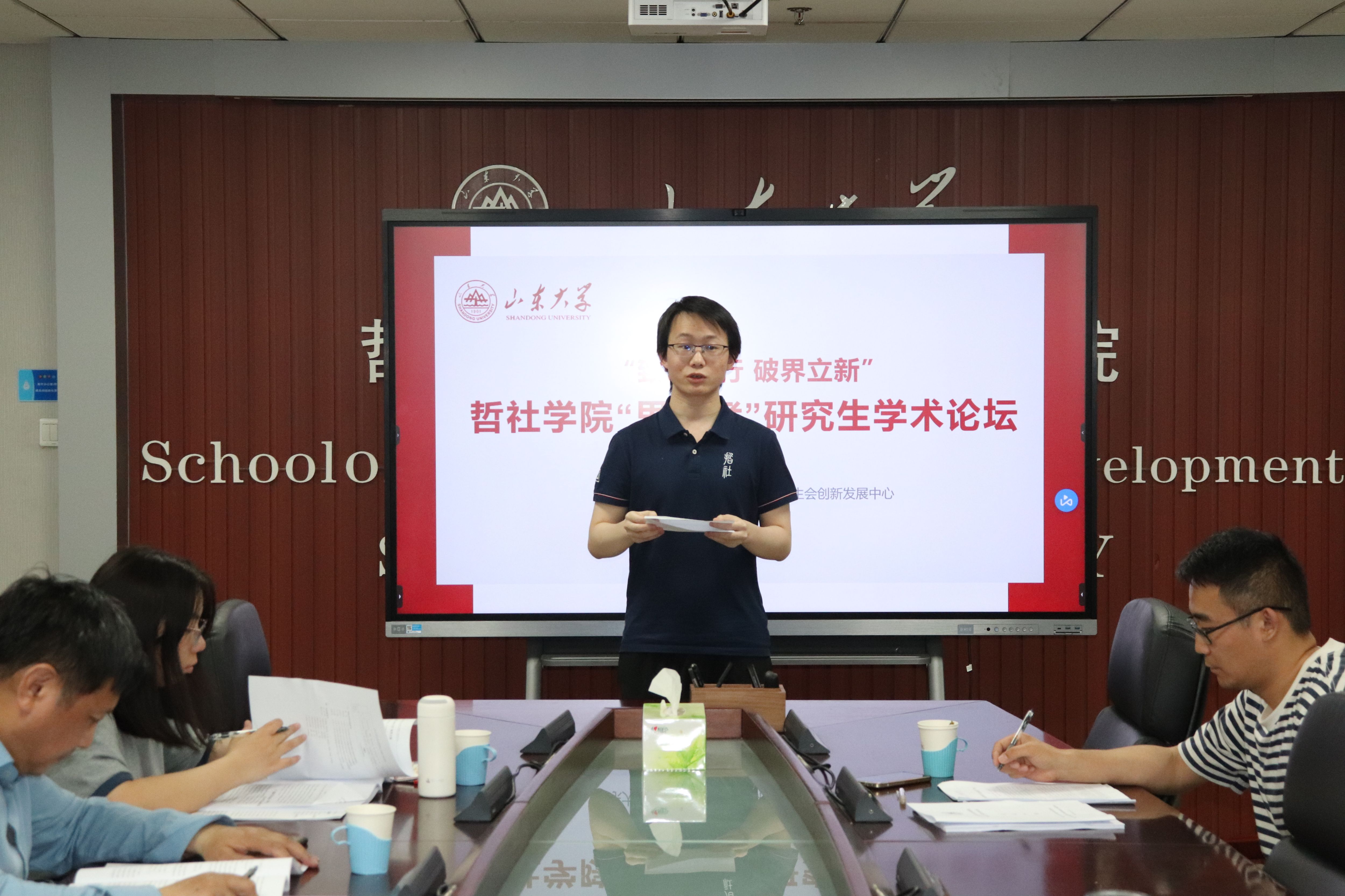 本届论坛共收到投稿30余篇,经专家匿名评审,最终录用优秀论文10篇,涵盖哲学、社会学、社会工作等多个领域,相关研究成果充分体现了学院学科特色和专业科研前沿。会上,刘开泰作了题为《工作时间不稳定对劳动者健康的影响及其群体差异》的报告,运用定量研究方法分析了非标准工时制度对劳动者生理与心理健康的影响。能星辉作了题为《唐君毅“生生”儒学论》的报告,系统阐述了传统儒家思想注入现代生命哲学的多元活力。杨泉作了题为《文化工业是如何控制大众的?》的报告,探讨了文化工业的运作机制与文化解放的可能路径。张琳艳作了题为《新中国残疾人家庭政策75年:历史演进、内在逻辑与优化路径》的报告,系统梳理了残疾人家庭政策的变迁脉络。江李鹏侨作了题为《修证一等:日僧道元的禅法修行观》的报告,阐述了修行哲学对东亚禅学实践的影响。李玥廷作了题为《论此在的本己性与共在》的报告,论证现代社会个体如何在技术化生存中保持“向死存在”的本真性联结。栾恺作了题为《情绪劳动视域下社会工作者服务质量研究》的报告,揭示了社会工作者情绪劳动强度、策略选择与服务成效的关联机制。辛月作了题为《马克思〈1844年经济学哲学手稿〉“人与自然互为对象”的张力》的报告,思考了自在自然作为母体之于人类主体的反思作用,对人与自然相互对象化的关系作出有益探讨。赵文乐作了题为《程颐“敬义夹持”的工夫论及其“中”说》的报告,聚焦二程理学核心命题,揭示了“持中守敬”的伦理实践对当代道德主体重建的启示意义。周子龙作了题为《国家何以“进村”:驻村制治理中的伦理逻辑》的报告,基于鲁东D村“驻村帮扶”田野调查,为乡村振兴提供治理范式参考。
