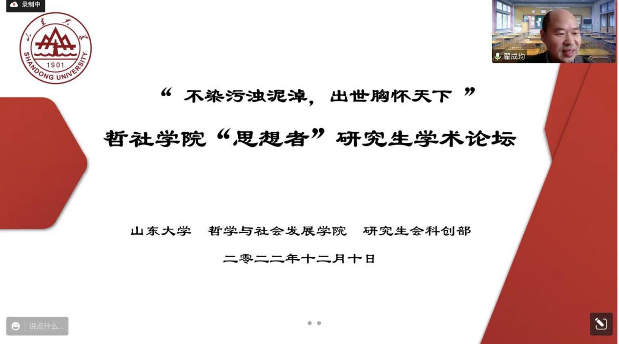 开幕式上,翟奎凤教授及参会学生代表分别致辞。翟奎凤教授指出,在研究生培养环节中,学院层面需要构筑一个学术共同体,而《思想者》论坛是一个很好的形式,有助于在学院层面加强学术氛围,对研究生学术水平的提高也有重大帮助。王鹿萍同学表示哲社学子要胸怀家国情怀,肩负时代重任,能够解民生之多艰,化理想为行动,书写灿烂华章。
