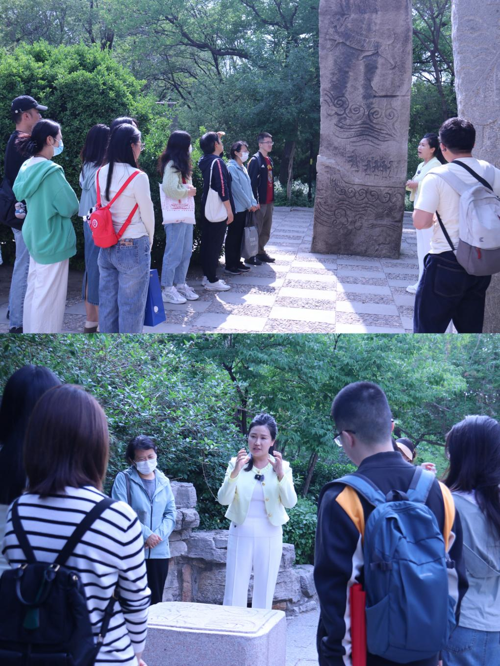 活动开始,师生沿舜文化研学路线参观了“尧帝访贤”“历山溯源”“舜耕历山”等文化景观,以“玉璜玉壁”为线索游览了古代圣贤在齐鲁大地的文化脉络。张院长向师生阐释了“五方大印”的文字哲学与心学文化要义,引导师生从汉字文明中体悟“德孝仁和”的舜文化精髓。在大舜石图园研习环节,师生以大禹治水等经典传说场景为切入点,深入探讨华夏文明“天人合一”“人与自然和谐共生”的治理智慧,系统梳理德治思想的现代转化路径及其对社会治理创新的启示价值。