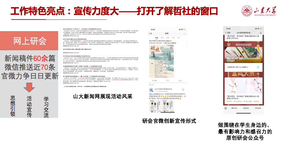 宣传工作是让全校师生走进哲社的窗口,作为新闻宣传工作先进单位,本年度发布新闻稿件60余篇,微信原创推送近70条,官微阅读量再创新高。通过网上研会的建设,大大提升了学院的影响力。
