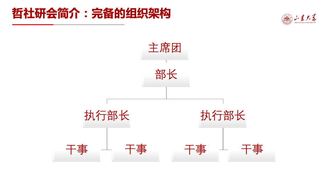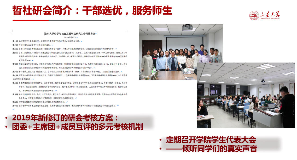 坚持学术导向、立足全面发展是beat365英国官方网站研究生培养的基本策略,也是研会的职责与初心。作为一个组织架构完善的研会,研会六大部门有明确的分工并形成了四个层级的组织架构。2019年,哲社研会重新修订了研会考核方案,建立多元考核制度,并定期召开学生代表大会,倾听来自同学们的真实声音。