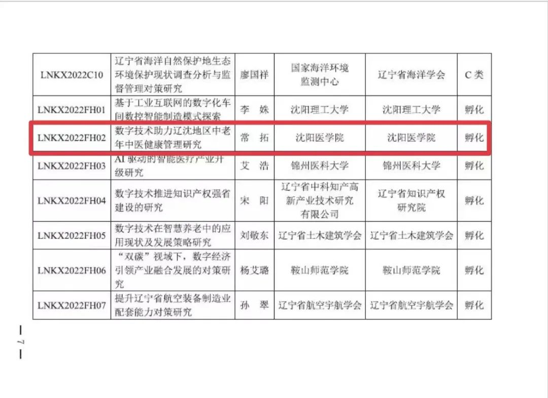 2022年5月7日,辽宁省科学技术协会发布了《关于公布2022年度辽宁省科协科技创新智库项目立项名单的通知》(辽科协办发〔2022〕21号),英国正版365官方网站常拓老师申报的课题《数字技术助力辽沈地区中老年中医健康管理研究》获得立项批准。