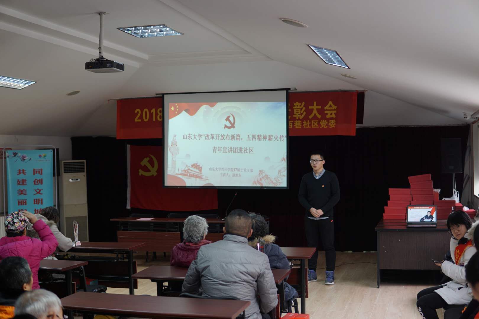 在大明湖街道县西巷社区,支部同社区联合开展的宣讲吸引了四十余名社区党员和群众参与。宣讲团队以“改革开放百名杰出贡献人物”身上体现的“奋斗精神”和“感动密码”作为开头,解读了被表彰的人物身上体现的“爱国、进步、民主、科学”的五四精神和拼搏奉献的敬业精神,现场观众纷纷赞同不已;宣讲团队同时邀请多位居民代表讲述自己的“青春故事”,陈述自己的“奋斗历程”。宣讲会结束后,宣讲团队与街道联合进行了社区志愿服务活动,进行社区服务和入户探访工作,赢得社区居民的一众好评。同时,社区与支部达成合作意向,支部将对社区老党员榜样进行访谈,以其奋斗经历为主体形成生命故事,供支部和社区党员进行下一步学习。
