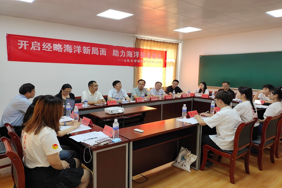 座谈会上,赵全超书记介绍了团市委与各驻青高校的关系和工作开展情况,胡明辉主席和滕乐峰处长分别就青岛市三下乡社会实践开展情况、青岛市海洋产业集聚区建设情况进行了介绍。我院辅导员封莹老师就我们团队的基本情况、调研目的、调研计划、学院社会实践工作开展情况等进行了汇报,队员郝杰作了表态发言。在听取师生们的汇报后,韩圣浩校长带领大家回顾了青岛和山大携手走过的光辉岁月,肯定了团队成员付出的努力,并对服务团如何开展好社会实践提出了具体要求。我们深受启发,并且信心大增。